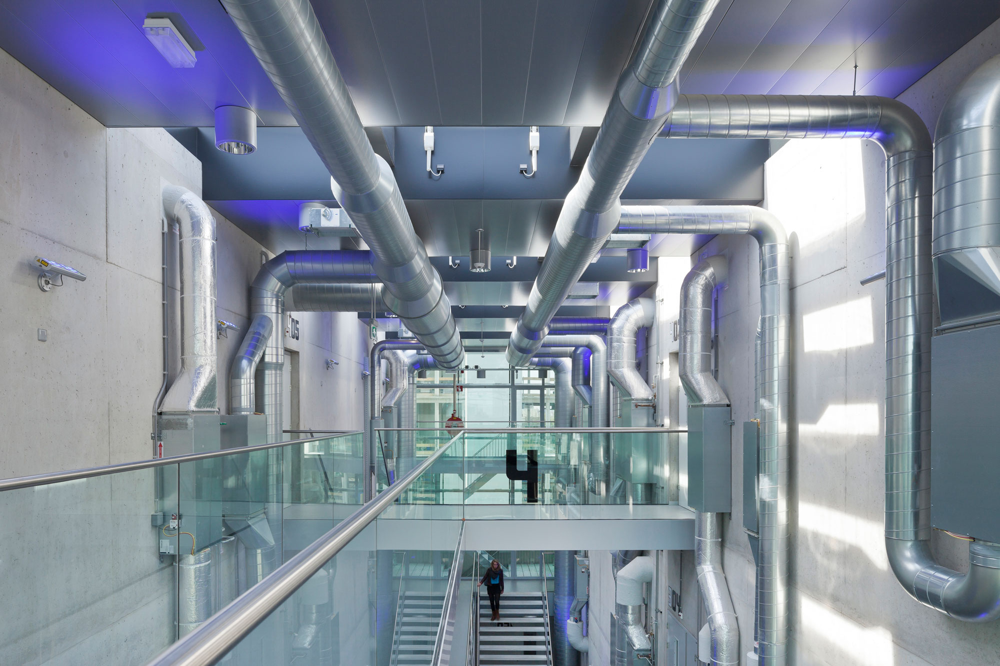 Via een goudkleurige entreehal komen de bezoekers binnen in een lichte, hoge en langwerpige vide, gelegen in het verlengde van de binnenplaats. Alle publieksfuncties zijn vanaf deze vide bereikbaar, zoals het café met een nieuwe zes meter brede glazen schuifpui aan de grachtzijde. De bewust in het zicht gehouden stalen pijpen van de luchtinstallaties geven de vide, samen met de lichtgrijze betonwanden, een sterk industrieel karakter refererend aan de oorspronkelijke fabrieksfunctie van het complex. In de volledig in glas uitgevoerde dakopbouw zijn dansstudio’s geplaatst, waardoor het gebouw met name ’s avonds een levendige uitstraling krijgt. Met de realisatie van CREA is belangrijke stap gezet in de transformatie van het Roeterseiland tot een levendige stadscampus.