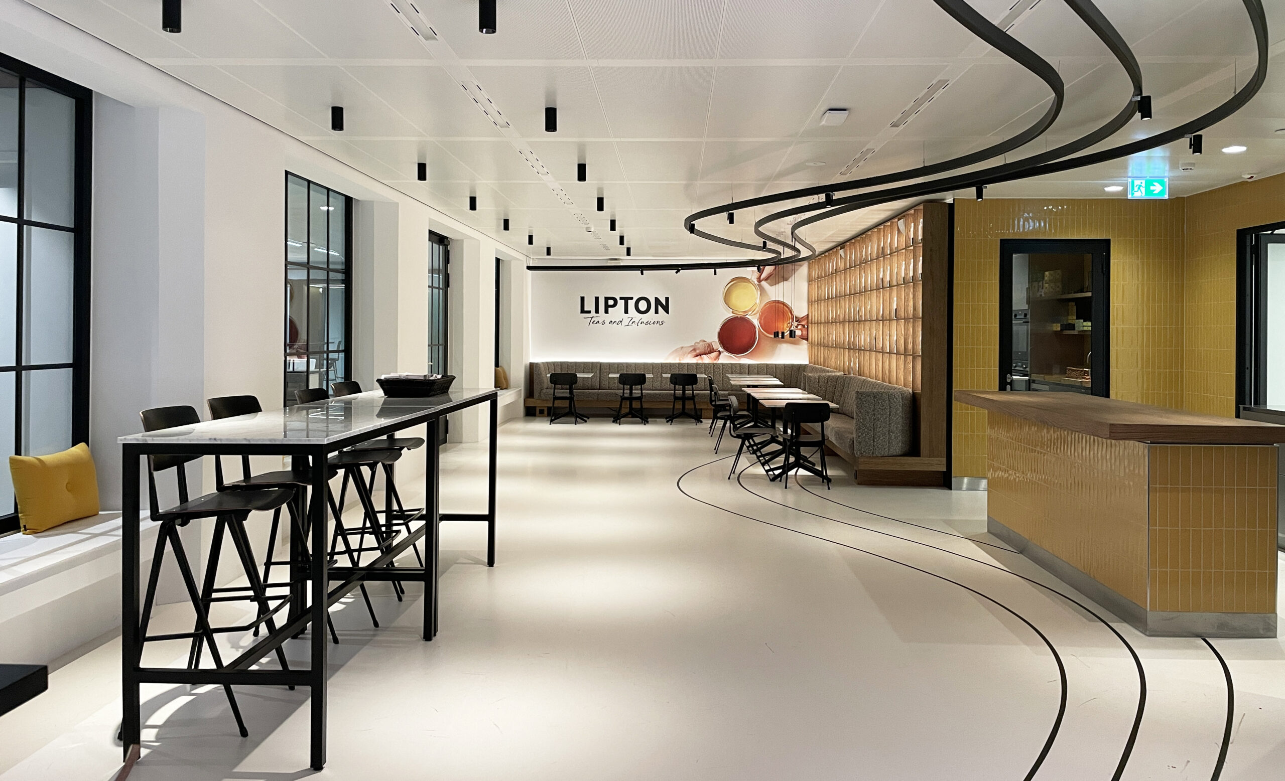 The meeting rooms also each represent a tea brand. The T2 meeting room is designed in the style of the T2 stores, using dark materials that frame the brand’s packaging well. In the Lipton meeting room, the distinctive lines and colors of the Lipton branding are reflected in the glass walls. These are done in a gradient, referencing the color palette of freshly brewed tea. The Pukka Loft is a multifunctional space with modular furniture, suitable for brainstorming sessions, meetings or informal gatherings and lunch buffets. In the PG tips meeting room, the signature tea box colors are incorporated into the curtains and chair bases, among other things, contributing to a cohesive and brand-related interior.