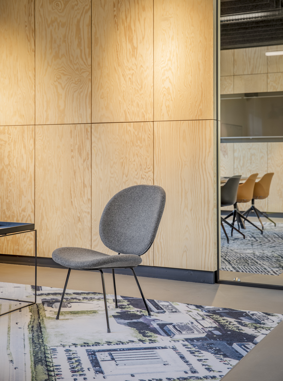 De industriële overheaddeur is gehandhaafd als entree, in principe staat deze deur de hele dag open en loop je via een glazen pui de dubbel hoge entreehal in. Vanaf de entree loopt een geel pad dwars door het kantoor. Het pad gaat over in een nieuwe trap en komt uit op de verdieping waar de werkplekken zijn gesitueerd. In deze kantoorstudio worden de bureaus afgewisseld met de akoestische Stealthkasten die in dezelfde gele kleur zijn gespoten. Vanaf de werkplekken op de eerste verdieping is er via een glazen wand een mooi uitzicht naar de entreehal die ook als ontmoetings- en pauzeruimte is ingericht. De 6 meter lange AVL-workbench en de industriële PH1 stoelen dragen bij aan het industriële karakter van de ruimte. Centraal in de hoge entreehal staat een hergebruikte container die is omgebouwd tot pantry en bar; het sociale middelpunt van het bedrijf. De vergaderruimtes zijn op de begane grond gesitueerd en zijn voorzien van speciaal gemaakte karpetten met luchtfoto’s van de verschillende bedrijfshallen die Urban Industrial bezit. In een enigszins afgescheiden ruimte aan de straatkant is een ontspanningsruimte ingericht, er staat een tafeltennistafel en een fitness apparaat opgesteld.